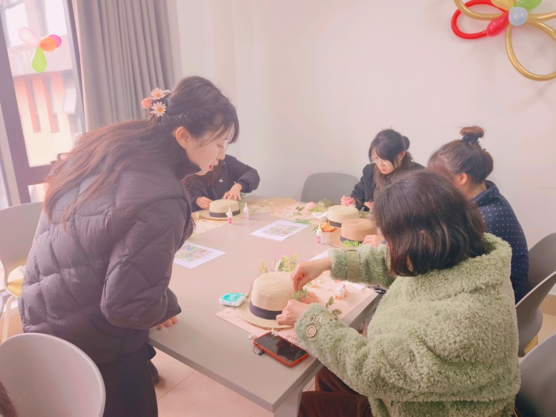 在专业花艺老师的细致指导下,参与活动的女师生们纷纷化身巧手匠人,开启簪花礼帽的创作之旅。大家手持剪刀,根据构思精心裁剪花枝长短,以胶水为媒,将朵朵鲜花错落有致地粘贴在礼帽之上。有人偏爱清新雅致,以素色小花点缀出简约之美;有人钟情明艳热烈,用缤纷色彩搭配出灵动之姿。每一次裁剪、每一次粘贴,都凝聚着独特的巧思与心意,一顶顶独一无二的簪花礼帽在指尖悄然成型。
