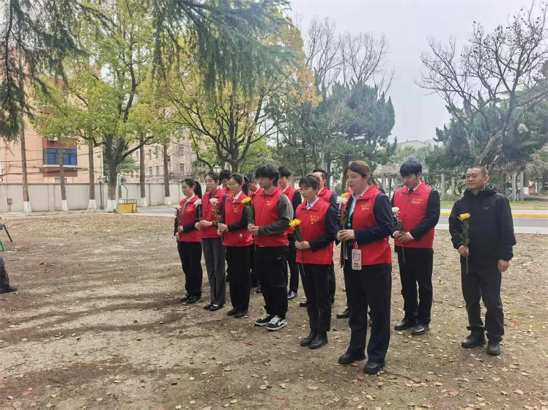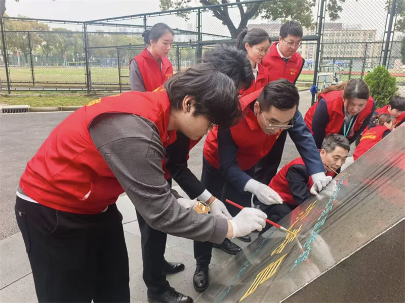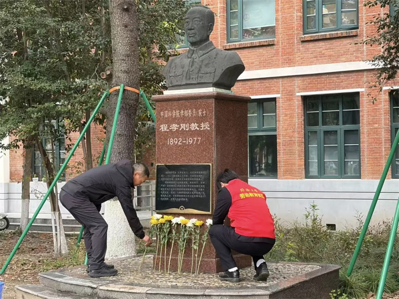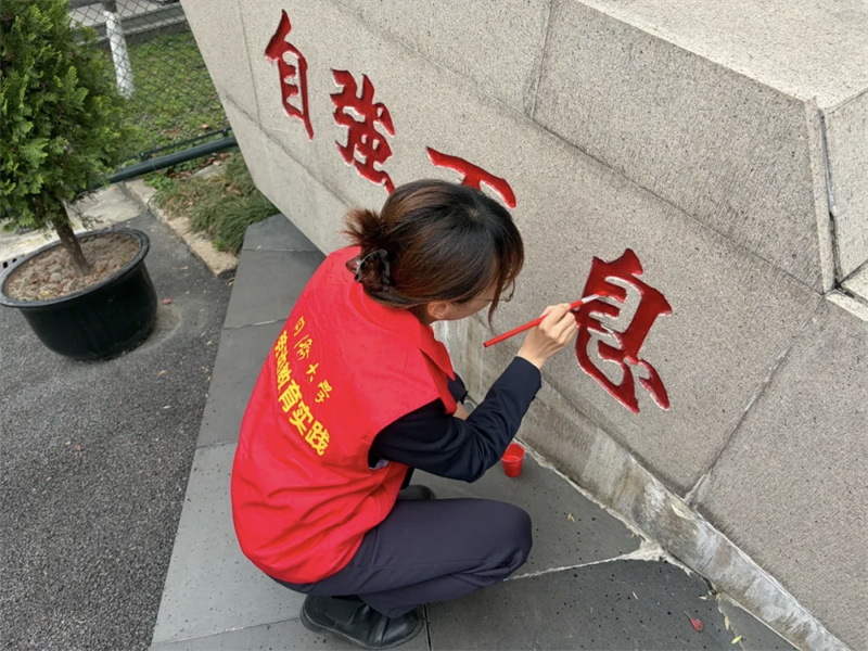活动现场,学生代表与物业人员手持扫帚、抹布、毛笔与油漆,怀着崇敬之心,分别对校区内的三处墓址进行了细致的维护。大家分工协作,有的仔细擦拭墓碑上的浮尘,有的则蹲在碑前,小心翼翼地用毛笔对风化褪色的碑文进行“描红”修复。一笔一划间,模糊的姓名与事迹重新清晰起来,仿佛在无声地诉说着那段峥嵘岁月。