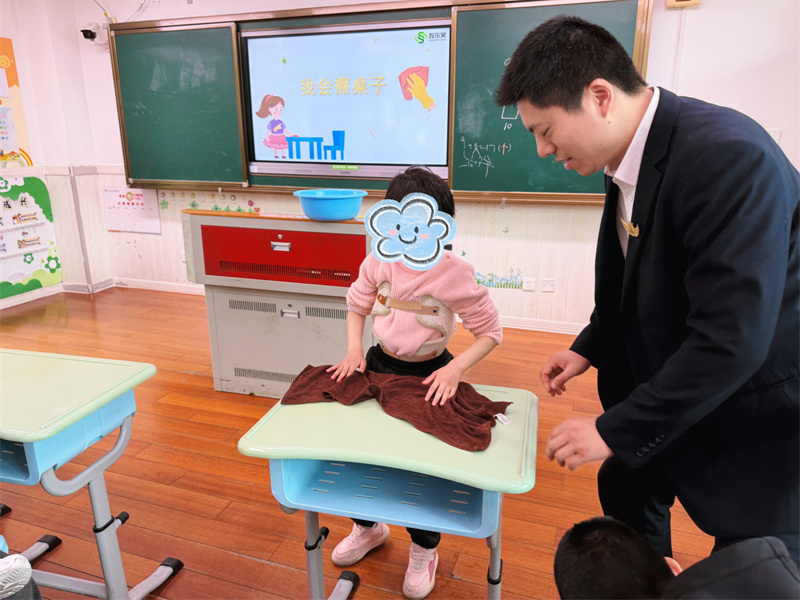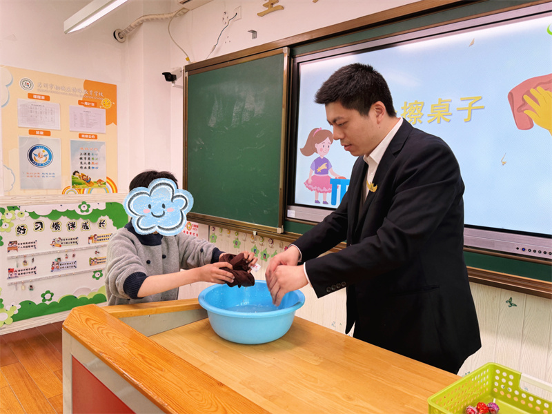 为助力特殊儿童提升生活自理能力,将劳动教育融入日常课堂,今日,东吴服务相城区特殊教育学校项目精心开展“劳动走进课堂”实践活动,本次课堂以“我会擦桌子”为主题,特邀相城二分部吴中人民医院项目负责人须逴明担任授课老师。