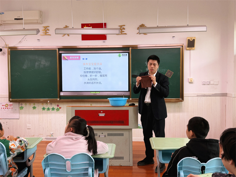 理论讲解结束后,须老师邀请小朋友们上台亲手实操,从浸湿毛巾、规范拧干,到按口诀折叠毛巾、分步擦拭桌面,全程耐心引导、逐一指导。此次劳动实践课,让孩子们在动手操作中掌握了简单的生活劳动技能,也切实感受到劳动的乐趣,彰显了东吴服务关爱特殊群体、践行社会责任的服务初心。