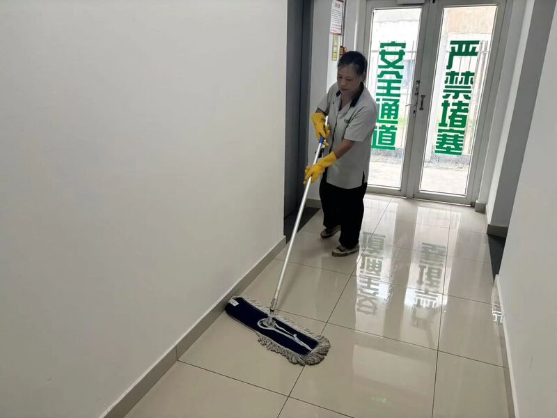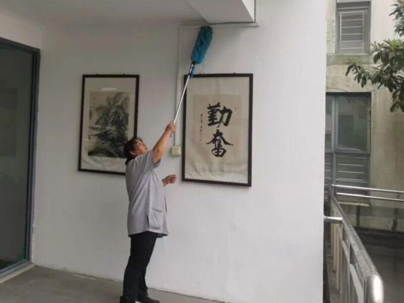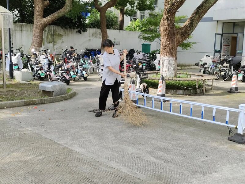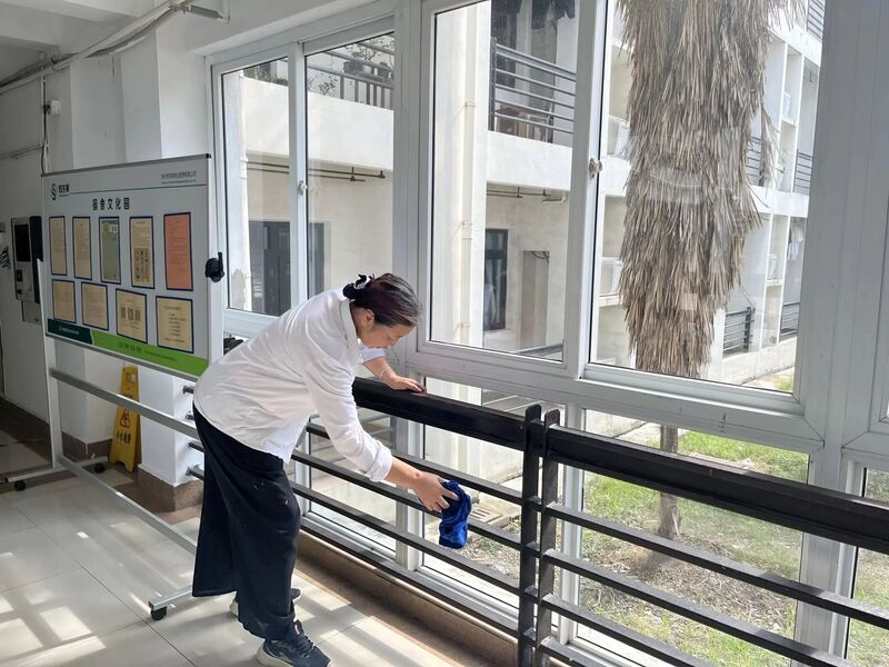保洁阿姨做好细保洁,不辞辛劳打扫户外落叶,一丝不苟清扫室内灰尘。
