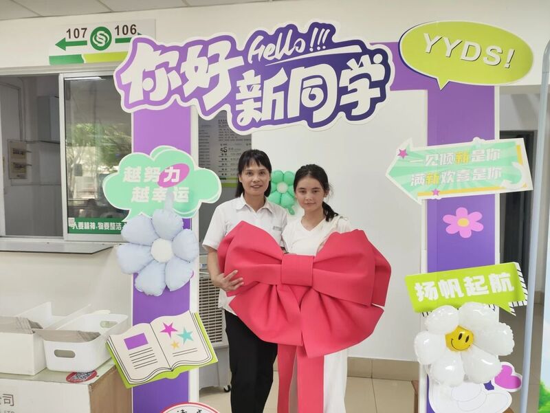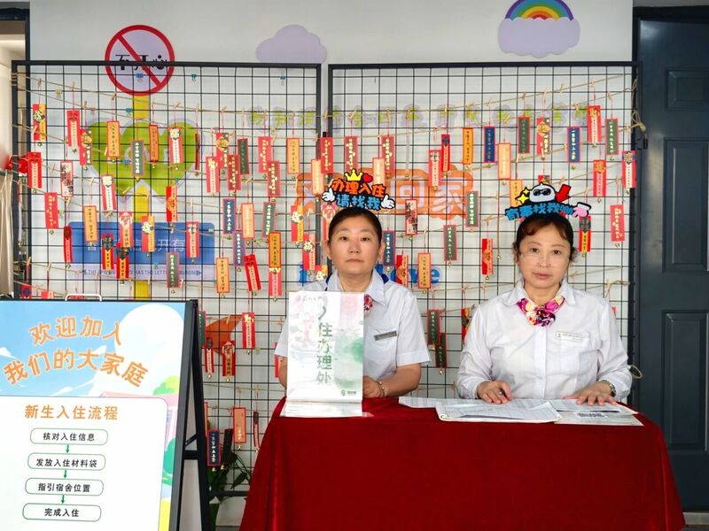 新生宿舍楼大厅设置主题打卡框,印有“欢迎新同学”“开启青春新篇”等标语,在女生宿舍楼还有精美大蝴蝶结做装饰,方便新生与家长拍照留念,记录入学美好瞬间。