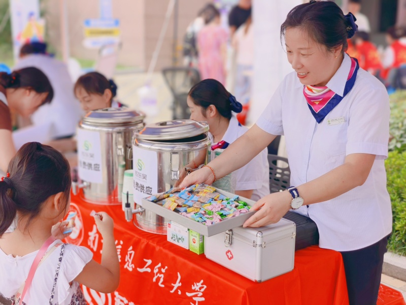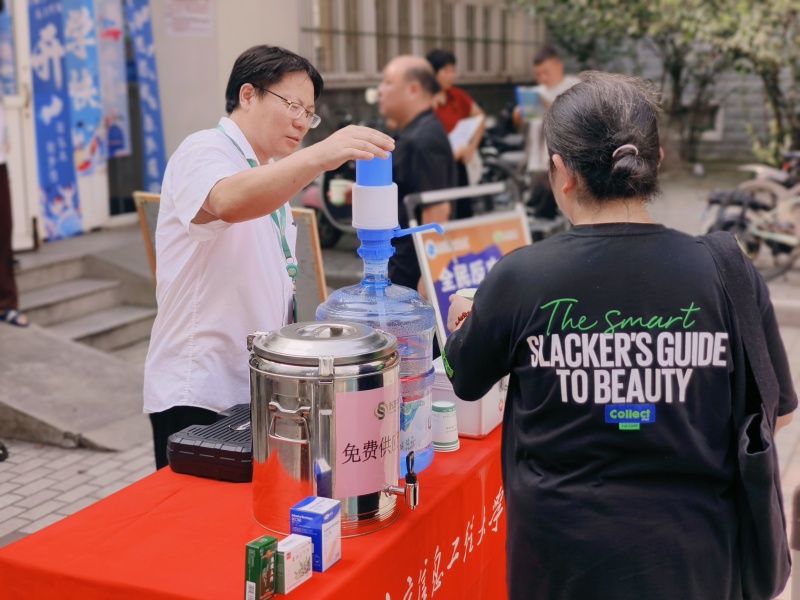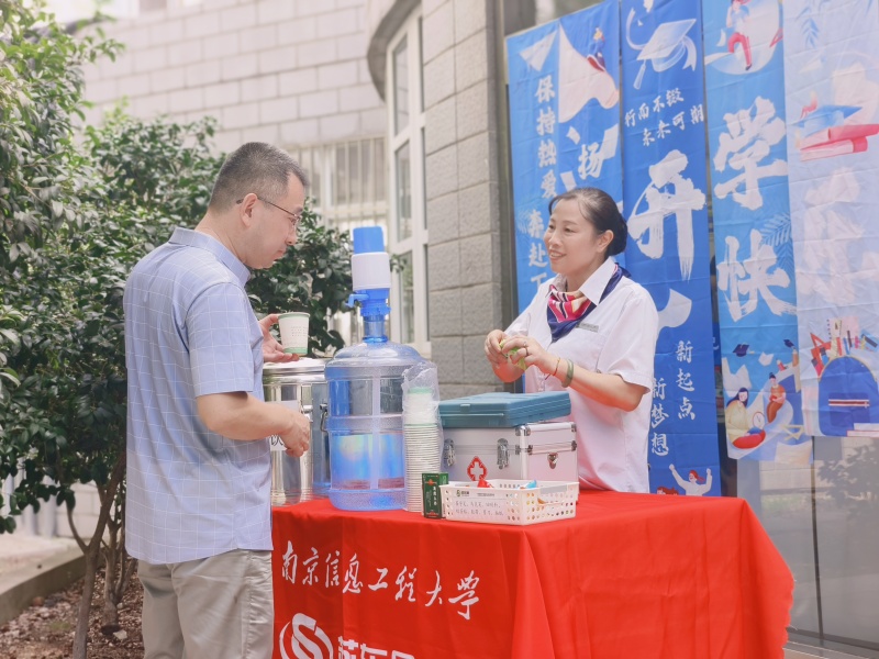 本次需要迎接6000余名新生入住,项目部分别在东区设立了4个站点,西区9个,南区2个,共计15个服务点,服务点全面覆盖宿舍区域,在报到期间,为新生及家长全天候免费提供酸梅汤、纯净水、小零食及防暑药品。项目工作人员精神饱满、笑容洋溢,宿管阿姨主动给学生及家长递上了清凉饮品和实用物资,细致关怀无声传递。