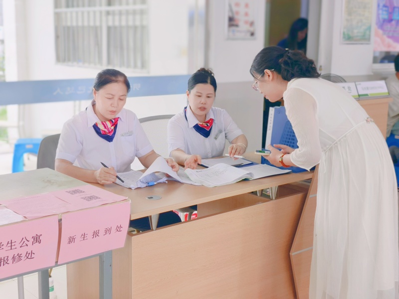 宿管阿姨在耐心办理完各项手续后,还会贴心地帮助学生搬运行李,并告知学生,宿舍如果有需要维修的,可直接到服务台报修。