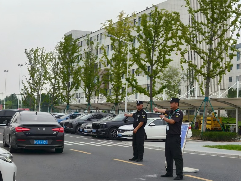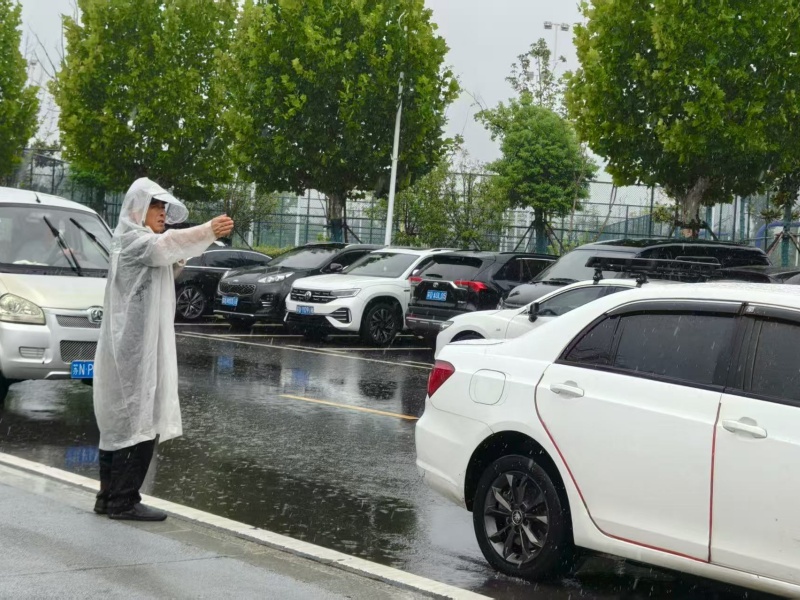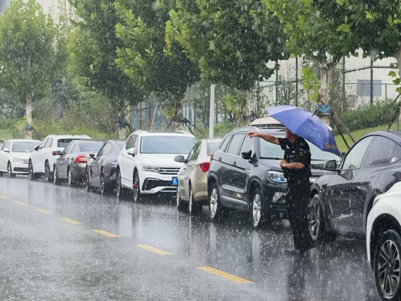 报到当天突降大雨,安保人员仍始终坚守岗位,冒雨在校内主要路口和公寓周边进行车辆疏导,引导车辆有序通行、即停即走,避免拥堵。雨水打湿了衣衫,却挡不住他们热情的脚步,只为让每一位新生和家长都能顺利抵达。
