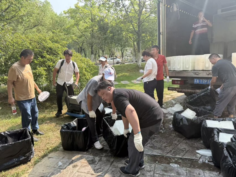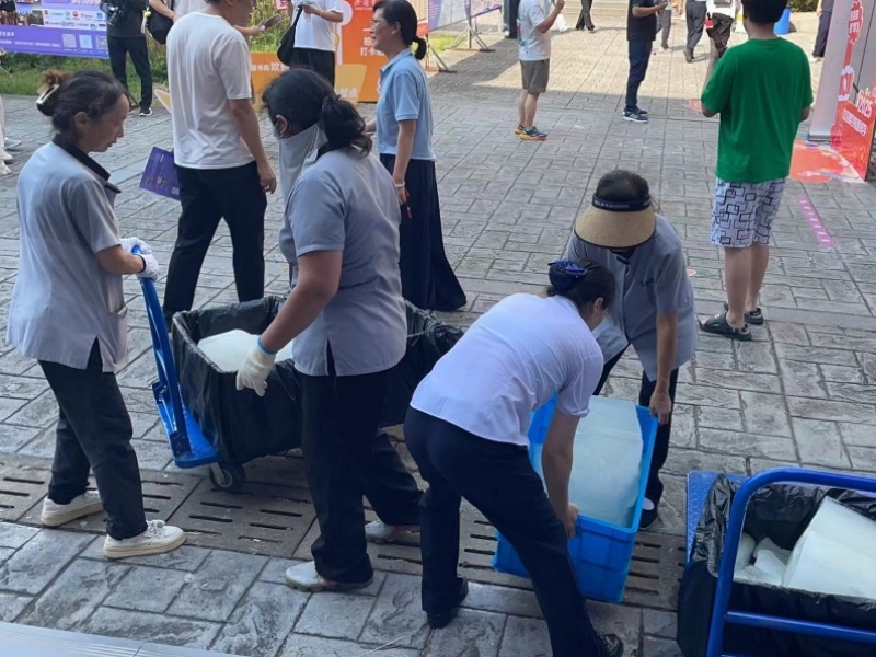 推车、铁锹、手套,大家在晨光中分装冰块,