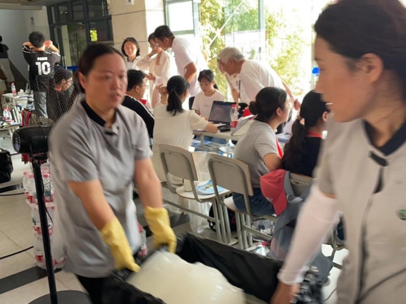 员工不断上上下下,陪同维修,解决学生遇到的麻烦,汗水湿透了衣衫。