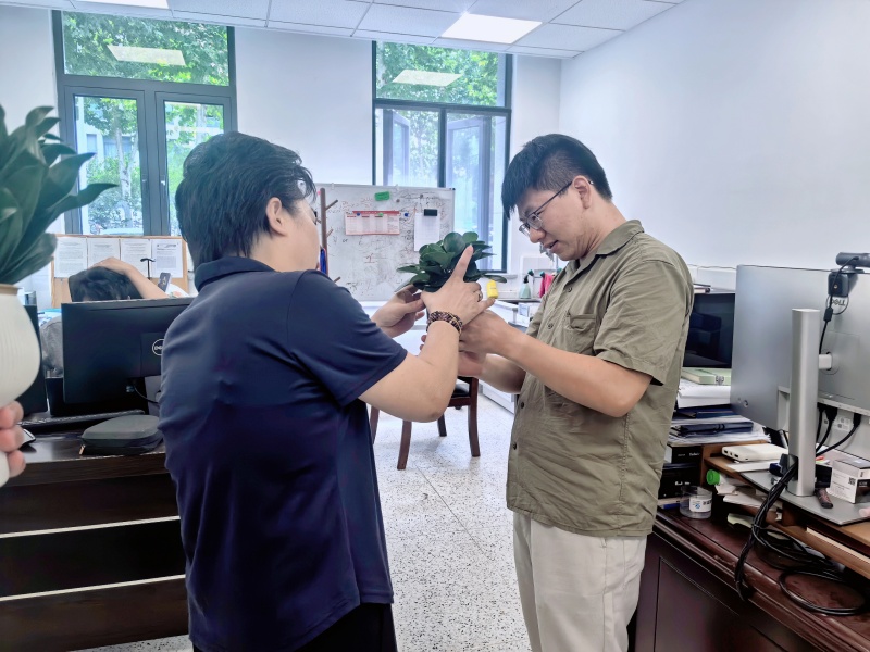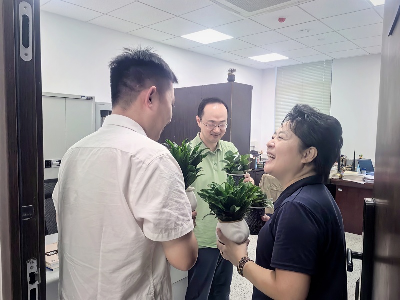 另一边,项目负责人带领慰问队伍,抱着一盆盆精心挑选的绿植,前往各个教师办公室。每到一个办公室,项目管理人员都亲切地和领导老师们打招呼,并将绿植郑重地送到他们手中:“这盆绿植放在办公室里,既能净化空气,又能让工作环境更有生机。”正在忙碌的老师们收到这份意外的礼物,纷纷表示惊喜又感动。