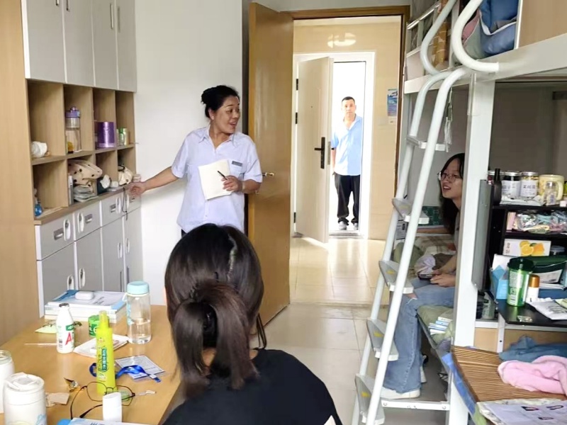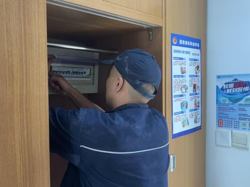 这边保洁阿姨忙得热火朝天时,维修师傅们也在宿舍楼里穿梭,认真开启“排查模式”。电路通不通、水路顺不顺,小到插座灵不灵、空调凉不凉,大到床铺稳不稳、卫生间排水畅不畅,每处细节都反复核对,像给宿舍做 “全面体检”。但凡发现问题,立即动手“开修”,绝不留半点安全隐患。