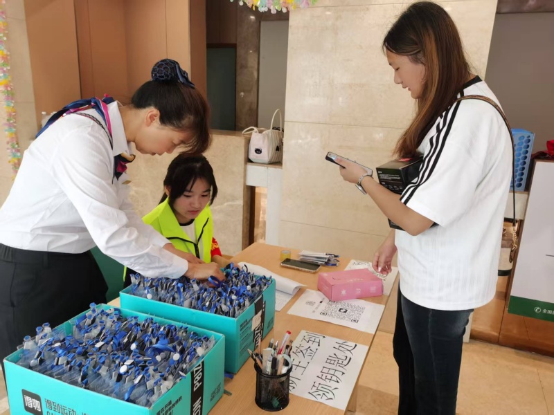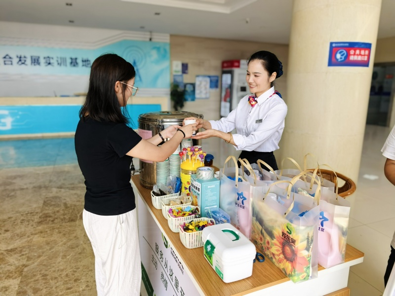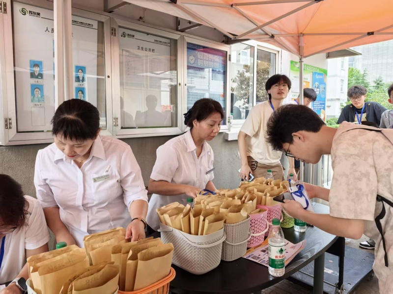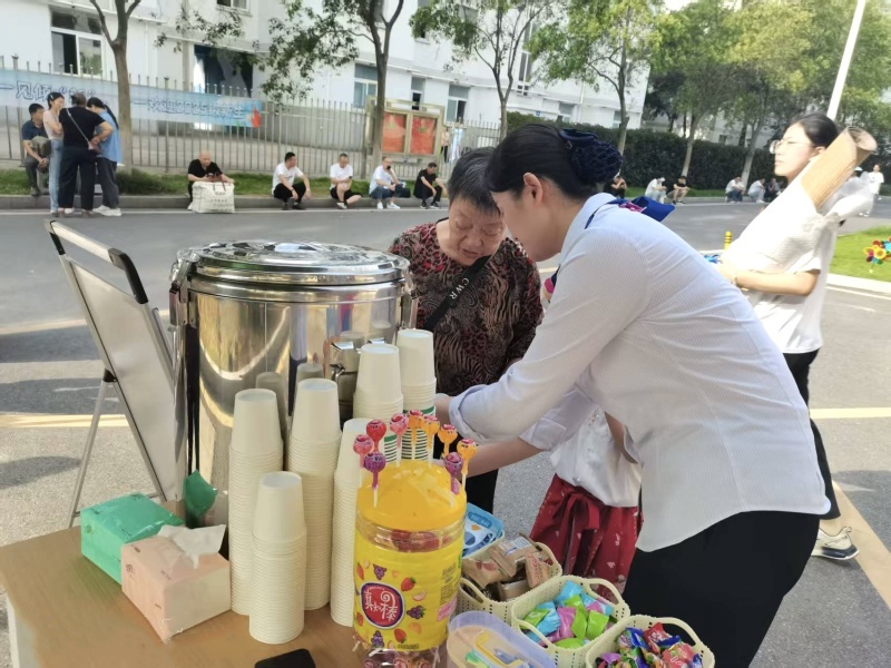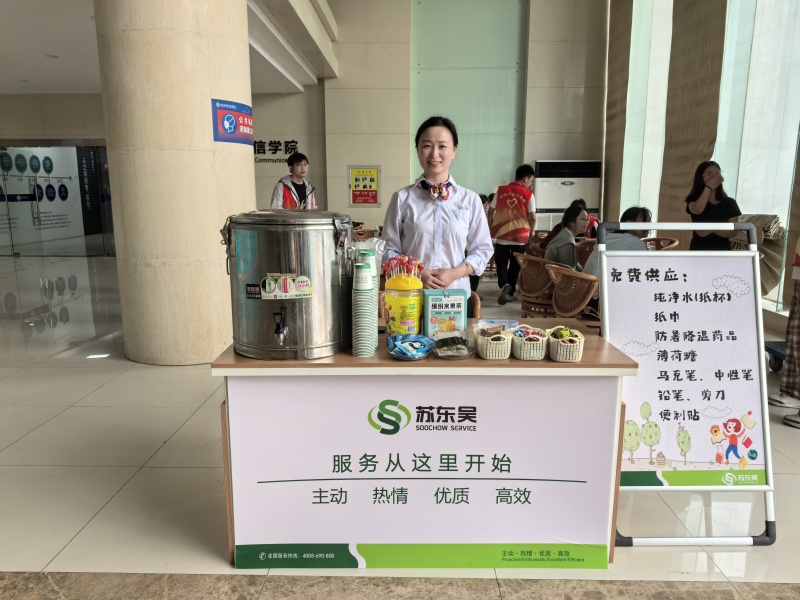 迎新当天热闹加倍!清晨6点,项目组的小伙伴们准时到岗,在公寓楼前支起服务台, “宠新模式”就此开启。服务台旁的茶水桶早已提前降温,工作人员端着杯子忙不迭 “投喂”:“同学喝口水,歇会儿再报到!” 炎炎夏日里,一口凉茶下肚,清爽直抵心底。桌上的糖果、点心、防暑药品、纸巾、医药箱,就像藏着惊喜的百宝袋,把小萌新的需求全妥帖装下,满是细心与暖意。