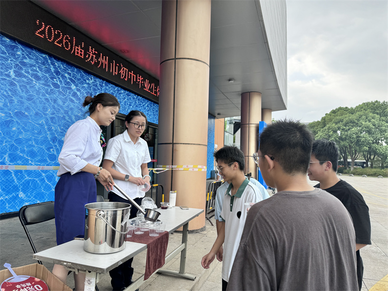 客服为考生发放游泳馆手环、姜汤,一碗碗姜汤传递到考生手中,有效帮助考生驱寒暖身,补充能量,舒缓疲惫的状态。