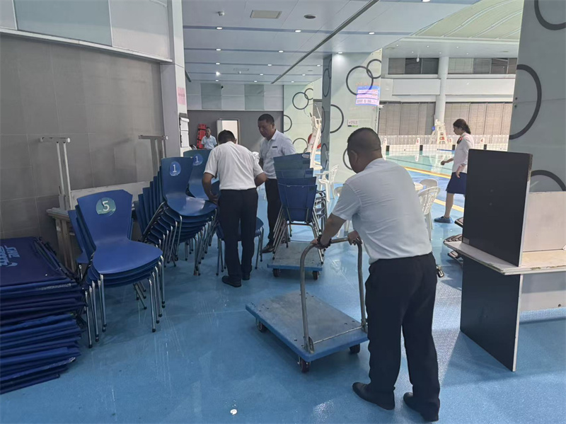 考前,保洁对游泳馆所有覆盖的区域进行深度清洁:更衣室、淋浴区、泳池地面进行刷洗,柜门擦拭,对公共区域高频接触部位进行消毒,为考试营造清爽整洁的环境;考试中动态保洁,维持现场环境卫生,安排定点保洁员及时清理地面垃圾,清刮泳池、更衣室地面水渍,保持地面干燥,避免考生滑到。
