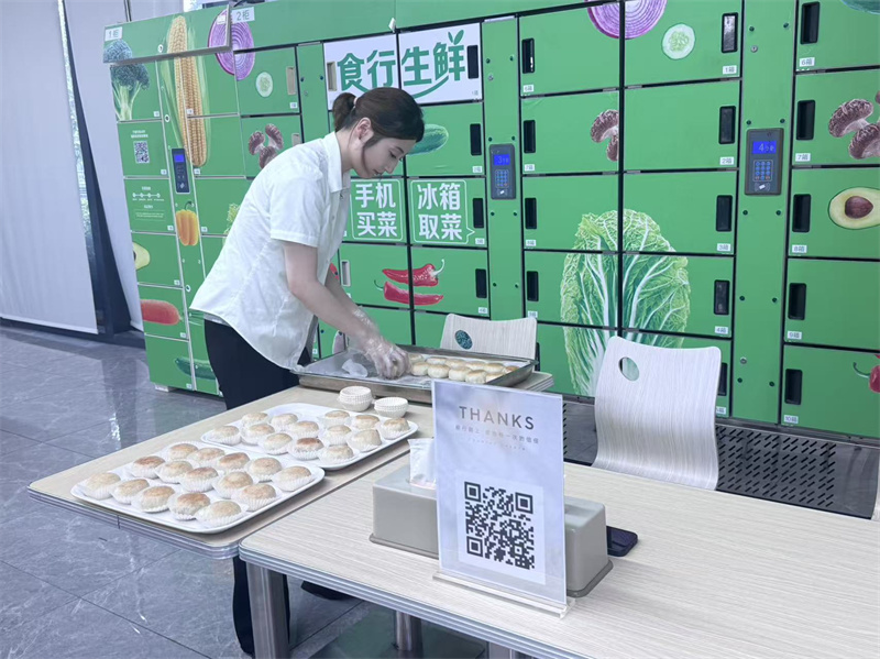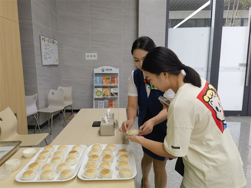 为让业主感受专属关怀,9 月 29 日,我们提前开启筹备。在项目后厨面点间内,面点师傅热火朝天的做着月饼,提前将精选猪肉制成鲜香馅料,再按比例揉制筋道面团,手指翻飞间,近一百份月饼生坯成型。不一会,一个个形态规整的鲜肉月饼在烤箱中逐渐金黄,浓郁的香气弥漫在食堂的每个角落,为次日的测评活动提前酝酿出温馨氛围。