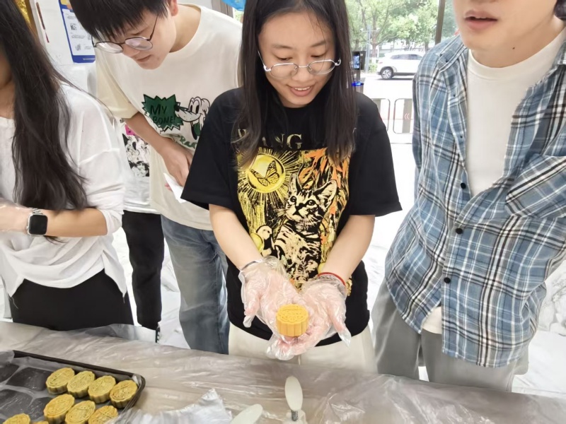 在宿管阿姨的耐心指导下,同学们迅速掌握制作要领:压薄面皮、包裹馅料、放入印有 “中秋快乐” 及 “桃苑、李苑、柳苑、桂苑” 字样的模具压实脱模,每一步都有条不紊。不一会儿,一个个形态饱满、带着专属印记的月饼便接连诞生。