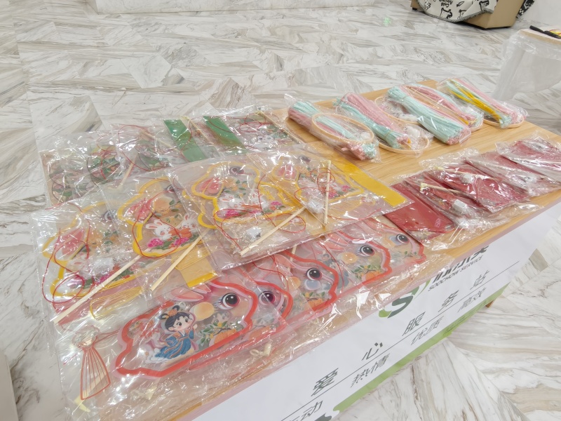 隔壁的花灯制作区同样热闹非凡。竹圈、彩纸、流苏、LED 灯串等材料整齐陈列,处处透着井然有序。宿管阿姨们各显神通:熟稔花灯制作的阿姨,手指翻飞间便搭好精巧骨架;另一边阿姨则与同学们合作,用扭扭棒制作萌趣灯兔,悄悄将 “祝祖国繁荣昌盛” 的美好祝福藏进灯兔里,让这份心意随花灯一同点亮。很快,一个个造型别致的花灯相继完成,点亮灯串的瞬间,暖光摇曳,节日的浪漫气息扑面而来。
