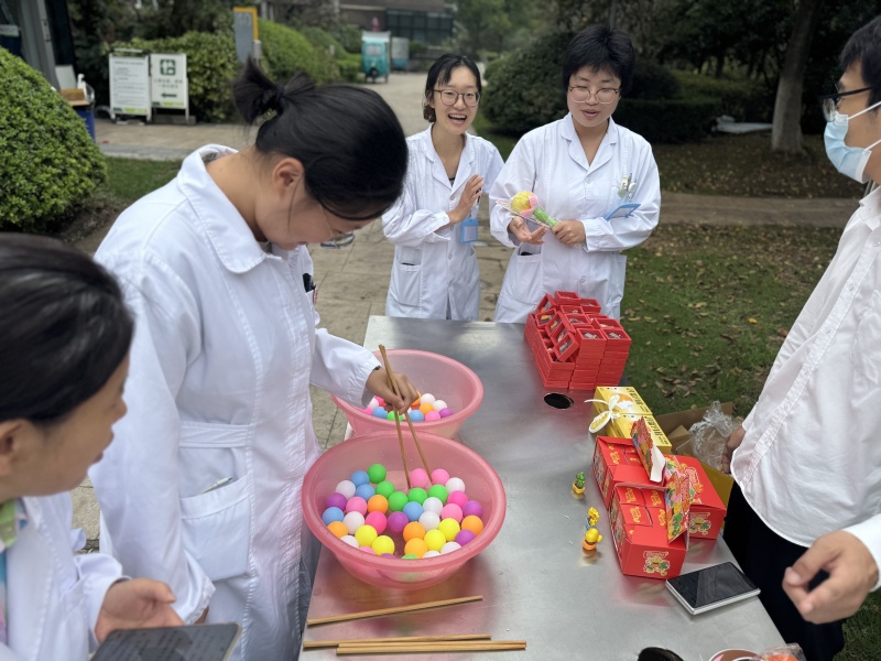 “水中捞月” 则是一场细功夫的比拼。水盆中,彩球随水波轻轻晃动,虽游戏规则要求使用非利手,但门诊部医生凭借日常执针换药练就的细腻手法,指尖轻夹筷子,乒乓球便稳稳落盘,那份从容与精准引得众人赞叹;军代表则屏气凝神,眼神锁定目标,手眼合一的专注尽显军人本色;所职工们则围在一起交流技巧,“筷子要直上直下”、“夹盆边的球更稳”,你一言我一语间,不仅找到了游戏秘诀,也拉近了彼此的距离。
