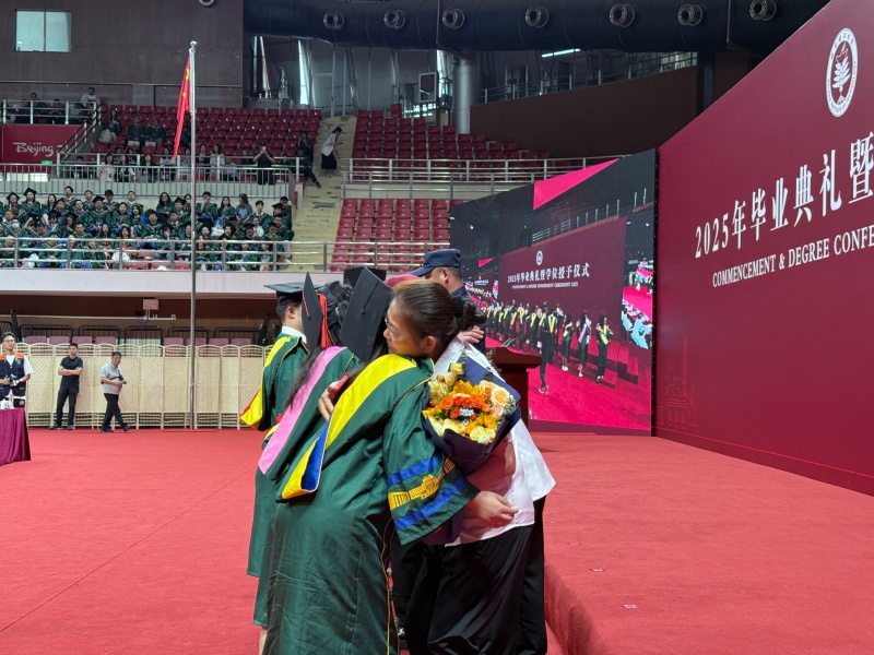 典礼上,毕业生代表向后勤物业员工献上鲜花,表达对物业服务团队默默奉献的诚挚谢意,温暖瞬间感动全场。