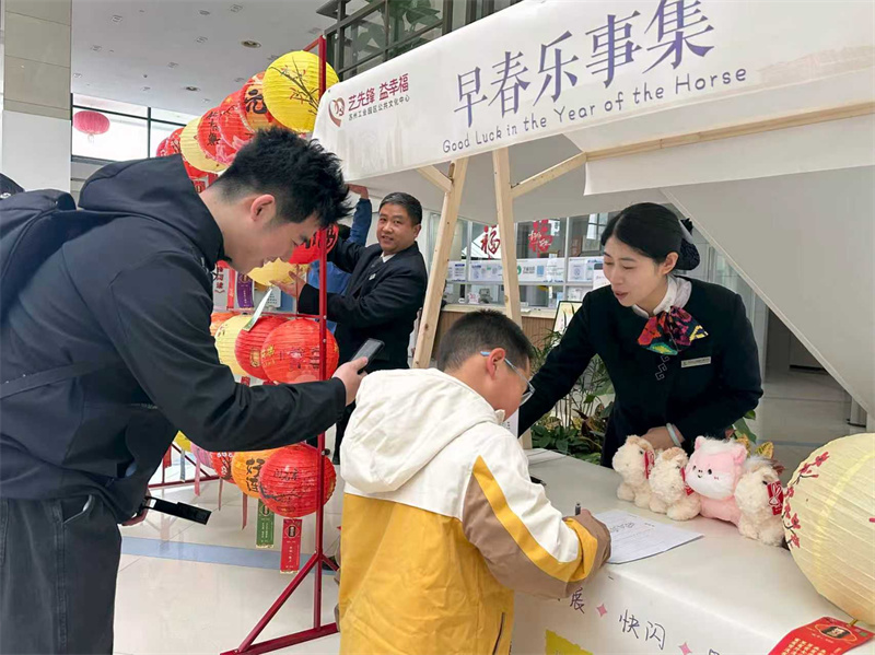 活动现场布置温馨又热闹,火红的灯笼高高悬挂,五彩斑斓的谜笺错落其间,灯谜涵盖传统字谜、成语典故、历史常识、地名风物、生活益智等多个类别,构思精巧、雅俗共赏。读者们或热烈研讨,或独自凝神静思,家长带着孩子亲子互动、共同解谜,现场欢声笑语不断,浓厚的节日氛围与浓郁的书香气息交融碰撞。活动期间,读者凭兴趣自由选取谜笺,猜出谜底后前往指定兑奖处核对答案,答对者可现场领取图书馆物业精心准备的精美礼品。公文中心项目工作人员全程热情引导、耐心服务,维护现场秩序,确保活动有序开展,用细致周到的服务传递节日温暖。