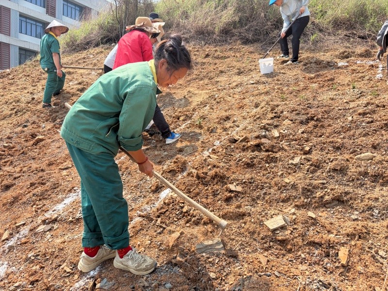 2026年4月10日,柳州工学院北校区T1、T2教学楼旁山坡绿意盎然、暖意融融。苏东吴柳州工学院项目团队联合学校后勤基建处,开展“后勤物业齐携手,樱麦绘就工院情”主题绿化共建活动,20余名项目工作人员与师生志愿者携手劳作,以撒播花种、栽植苗株、浇灌定根等方式,在1587平方米的山坡上精心打造“我爱工学院”特色景观,用劳动为校园添绿增彩,绘就生态育人新画卷。