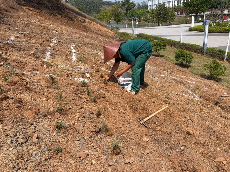 此次绿化行动优选适配校园环境的适生品种,兼具观赏性与实用性。美女樱适应性强、花期绵长,红色花株可清晰呈现logo视觉效果,预计今夏绚丽绽放;麦冬为优质地被植物,根系发达、覆盖力强,既能稳固水土、抑制杂草,又能与美女樱形成色彩搭配,打造长效生态景观。为守护绿化成果,项目部制定“每周巡查+月度养护”机制,联动学生志愿者参与后期除草、补种等管护工作,同步规划设置科普标识牌,讲解植物特性、生态价值与活动意义,将种植区打造为集生态观赏、劳动教育、科普宣传于一体的校园实践阵地。